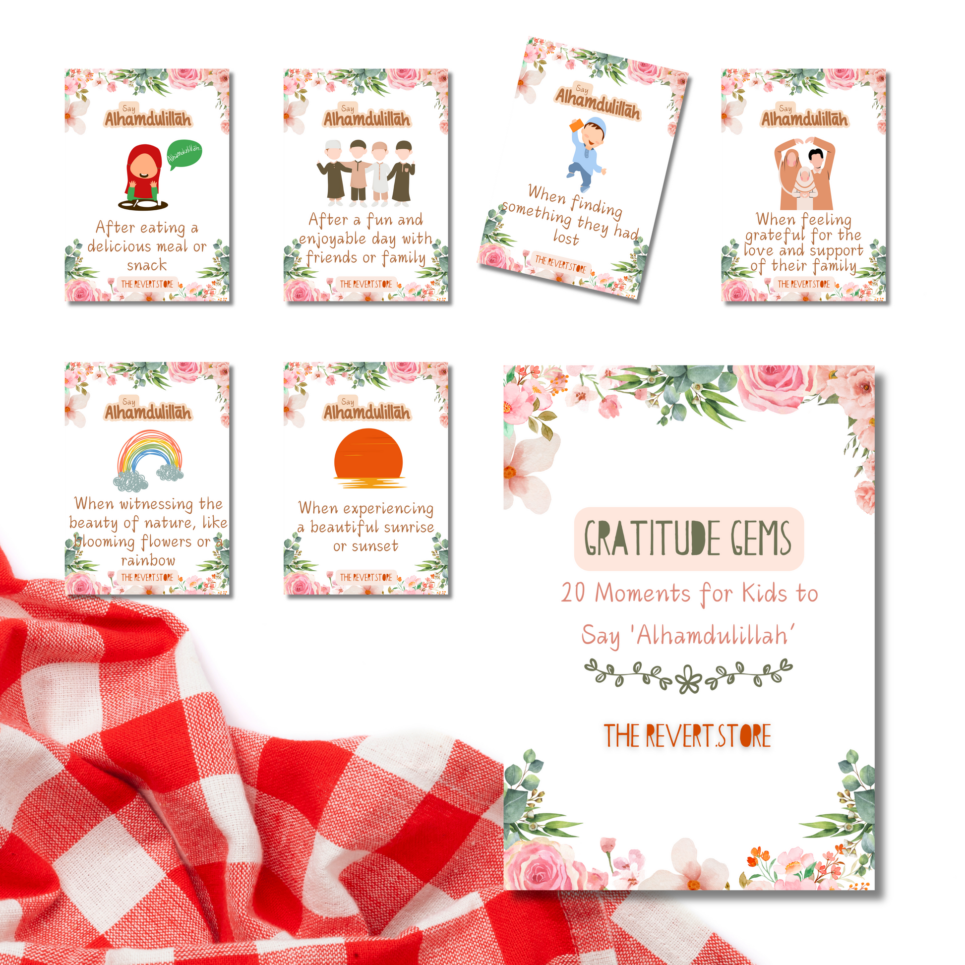 Empower your child with the knowledge and practice of gratitude with our "Gratitude Gems: 20 Moments for Kids to Say 'Alhamdulillah' Flash Cards"! Order now and nurture a heart full of gratitude in your child! 🌟